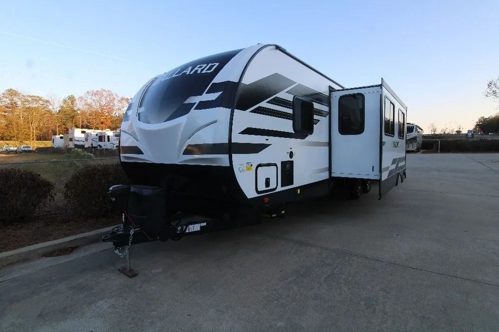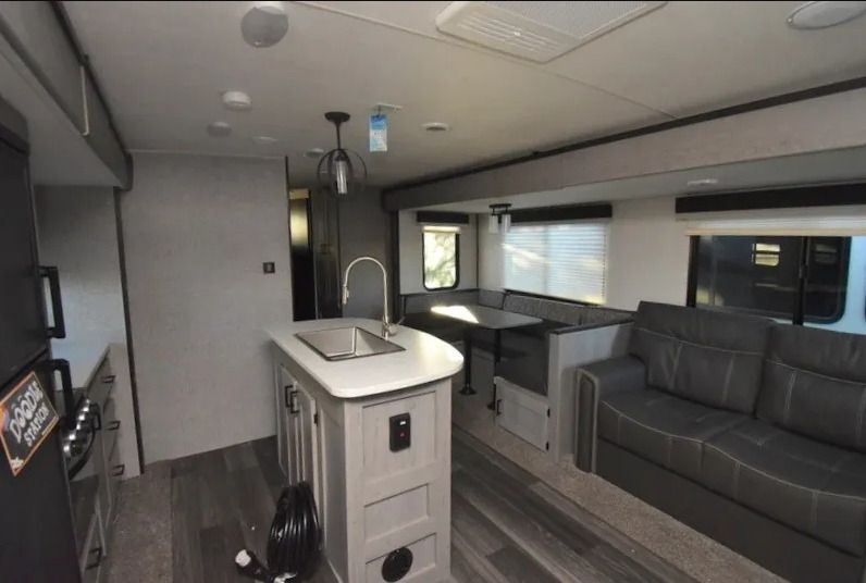 This is a luxury fifth wheel. Enjoy a king bed and 1 queen pull-out sofa. There is a separate room with a full-sized pull-out couch and TV. The kitchen boasts a residential-sized refrigerator and a dining table for 4. An outdoor kitchen, a cooktop, and a mini-fridge make this camper comfortable, and great for entertaining when camping with friends. A washer/dryer combo is also included.