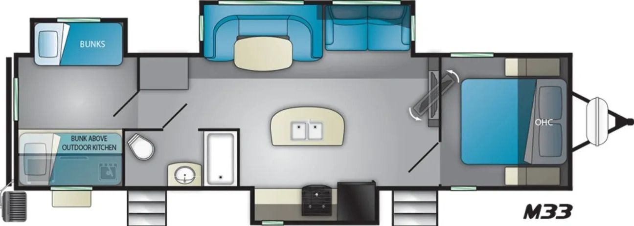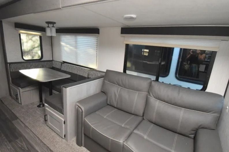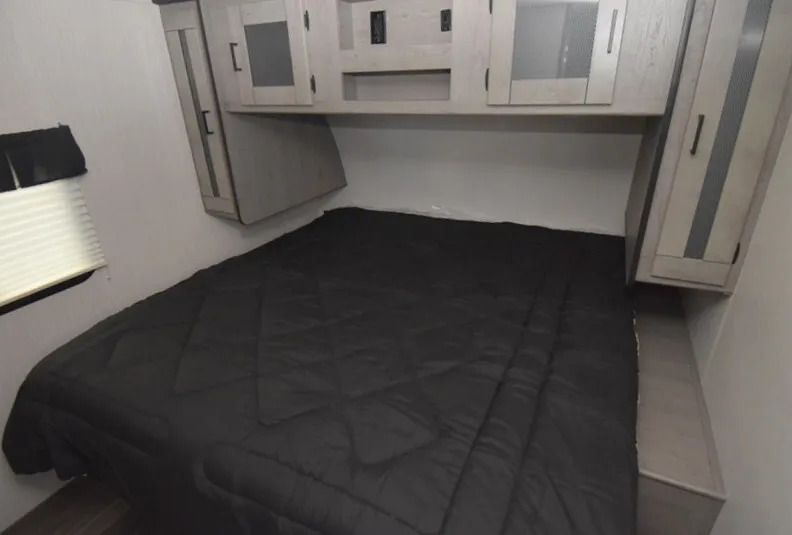 This is a luxury fifth wheel. Enjoy a king bed and 1 queen pull-out sofa. There is a separate room with a full-sized pull-out couch and TV. The kitchen boasts a residential-sized refrigerator and a dining table for 4. An outdoor kitchen, a cooktop, and a mini-fridge make this camper comfortable, and great for entertaining when camping with friends. A washer/dryer combo is also included.